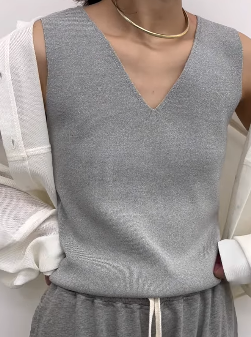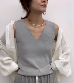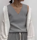 フロントがVあき、バックがクルーネックで、前後着用可能です。シンプルな形で様々なコーディネートでお使い頂ける優れもの。裾にミニスリット付き。