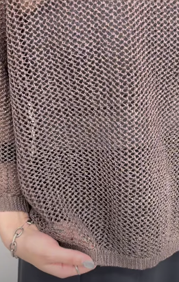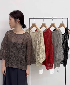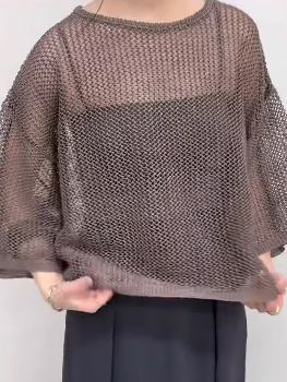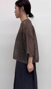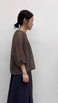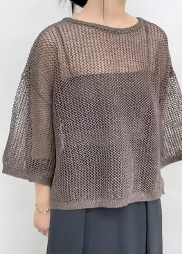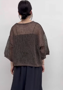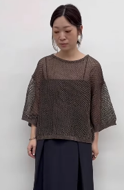 612-85528 と同じ編み地の、メッシュニットトップス。こちらはゆったりシルエットで、二の腕もカバーできる五分袖のデザインになります 。夏にさらっと着て頂ける一枚です。