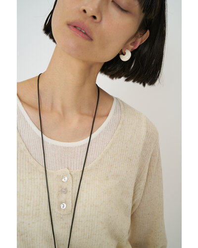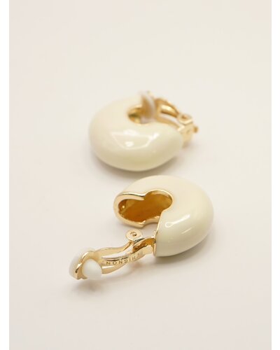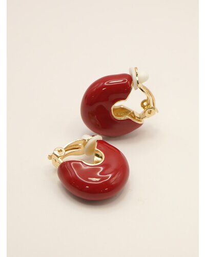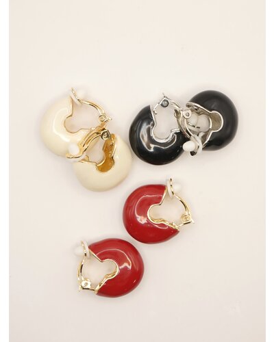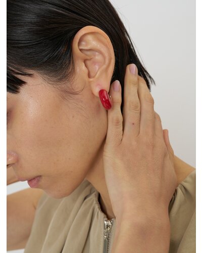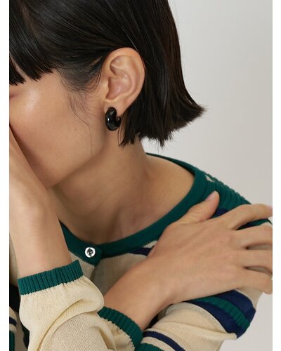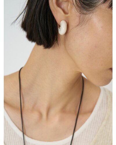 ころんと丸みのあるフープにエポ樹脂を施したミニイヤリングは、程よいボリューム感と存在感があり、着けるだけでいつものコーデをぐっと引き締めてくれます。オフホワイト、レッド、ブラックの3色はどれも落ち着いた大人なトーンなので洋服にも合わせやすくオススメです。メタル部分もちらっと見えているのでモードになりすぎず、品のある高見えアイテムとなっております。イヤリング金具部分には「CHIGNON」の刻印入り。同型でピアスもご用意いたしております。