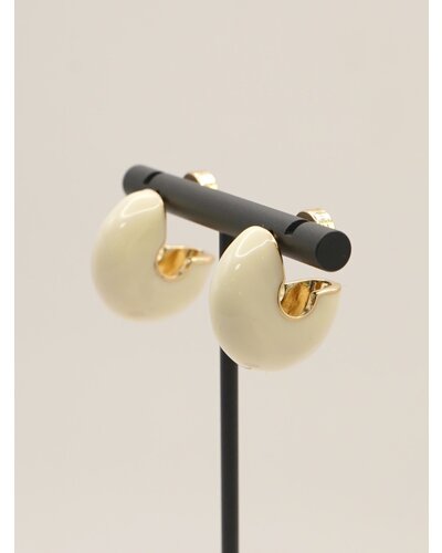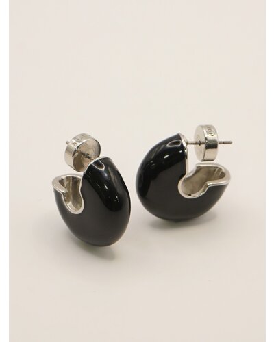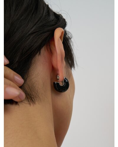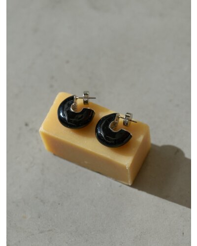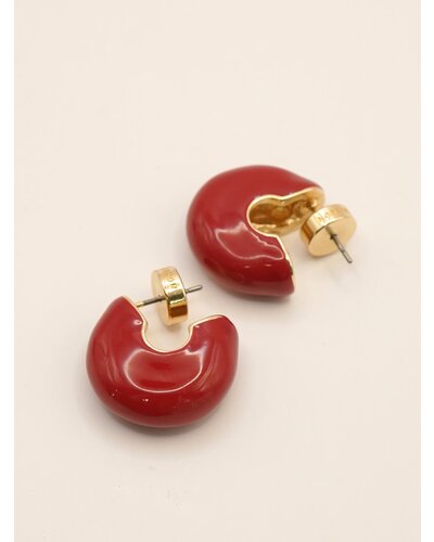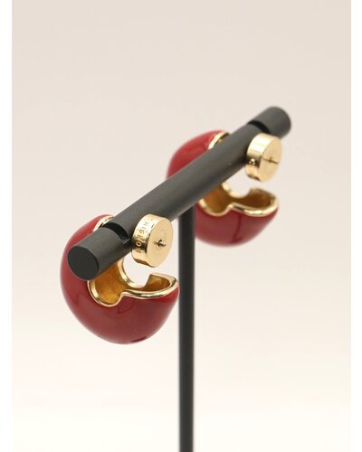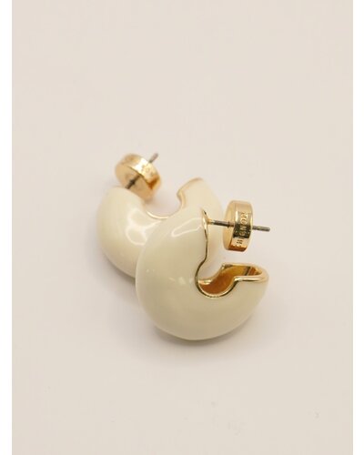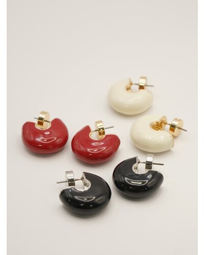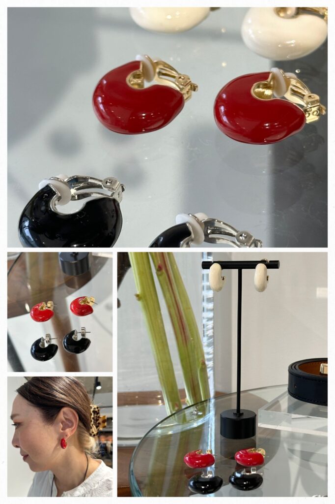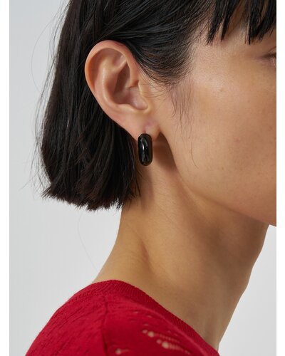 ころんと丸みのあるフープにエポ樹脂を施したミニピアスは、程よいボリューム感と存在感があり、着けるだけでいつものコーデをぐっと引き締めてくれます。オフホワイト、レッド、ブラックの3色はどれも落ち着いた大人なトーンなので洋服にも合わせやすくオススメです。メタル部分もちらっと見えているのでモードになりすぎず、品のある高見えアイテムとなっております。こちらのピアスはメタル円盤キャッチ付きとなっております。キャッチ側面には「CHIGNON」の刻印入り。同型でイヤリングもご用意いたしております。