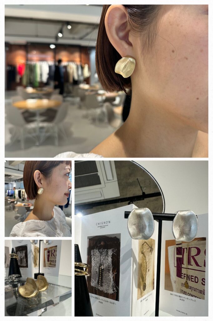 細やかなヘアライン加工が入った滑らかな凹凸プレートピアスは、丁度いいサイズ感とややマットなつや感でどんなコーデにも合わせやすいデザインとなっております。立体感があるので横からの見え方も◎また、片耳2.7グラムととても軽いので1日中着けてても耳が痛くなりにくいのも嬉しいポイントです。こちらのピアスは真鍮キャッチ&円盤キャッチ付きとなっております。背面には「CHIGNON」の刻印入り。