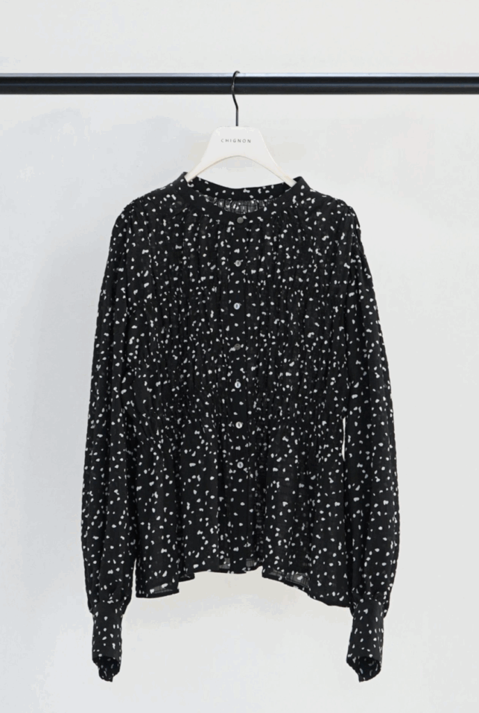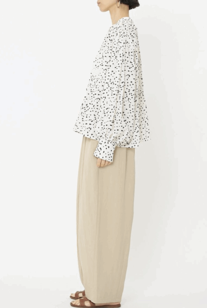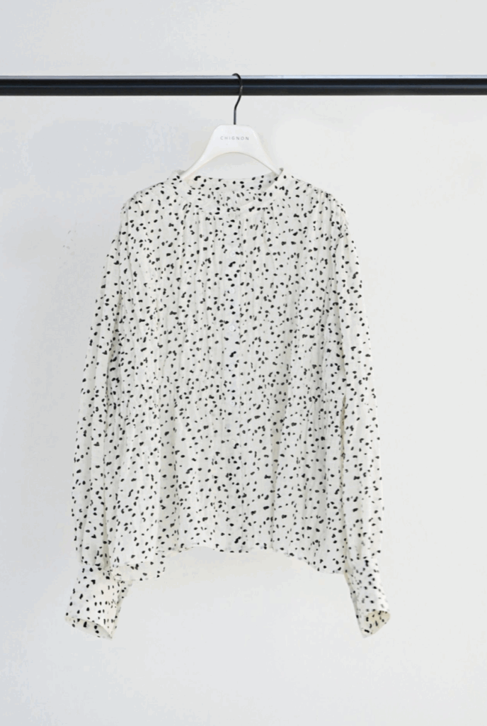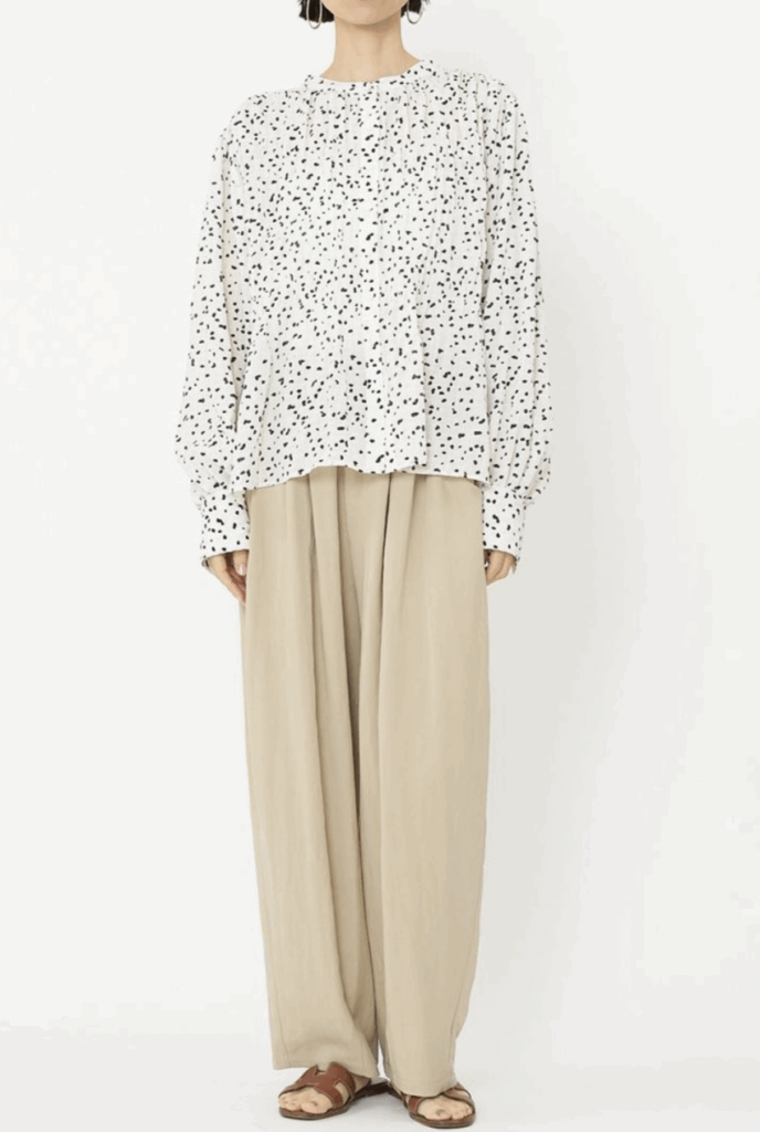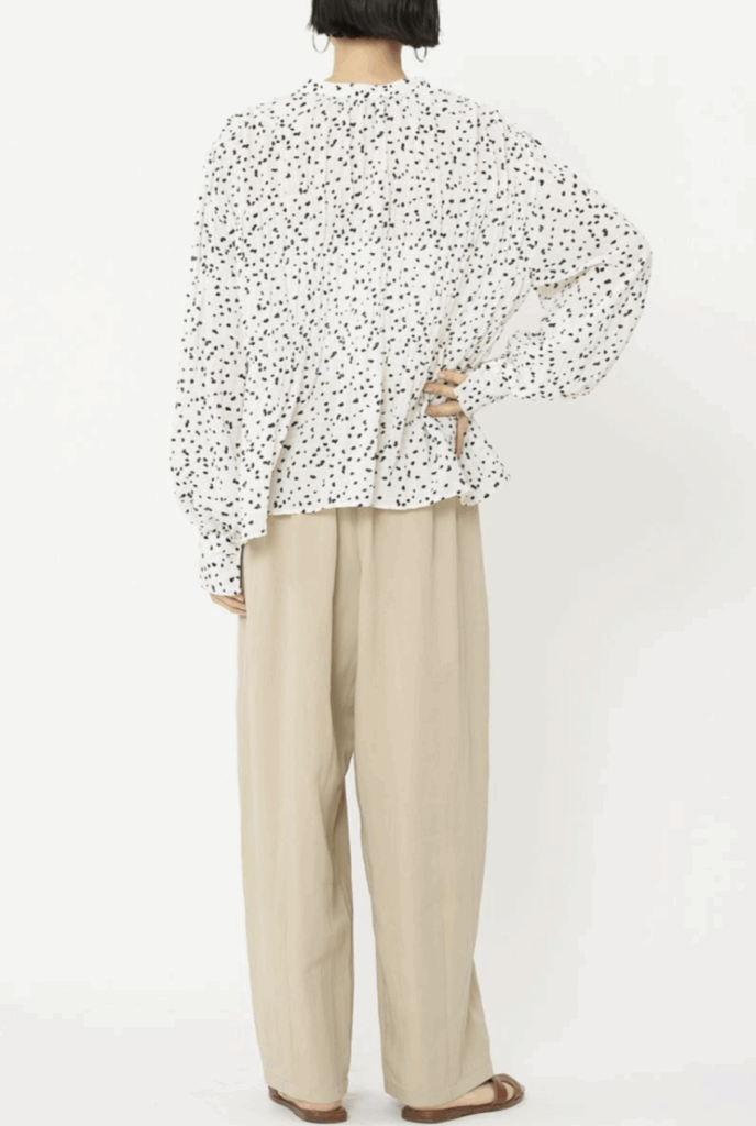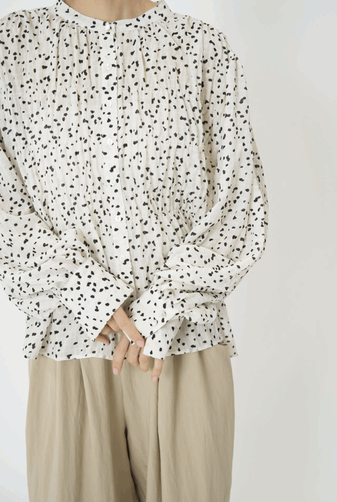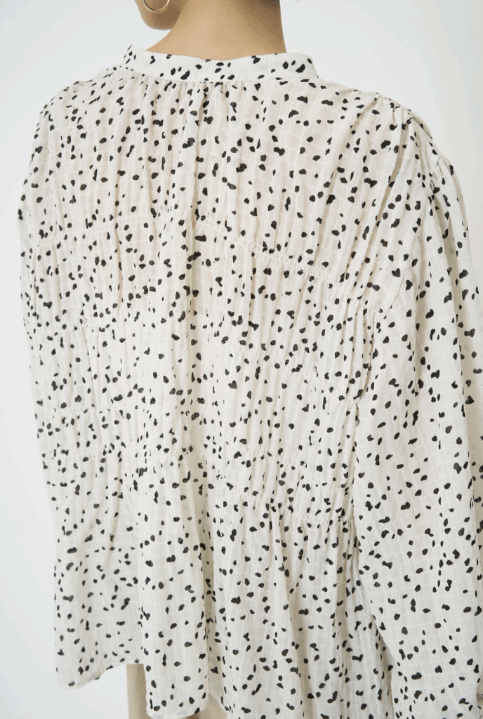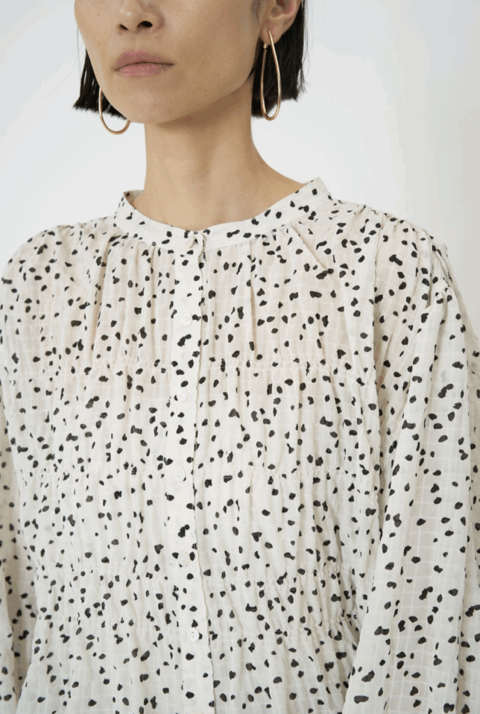 ドット柄を使用した、シャーリングデザインのブラウス。