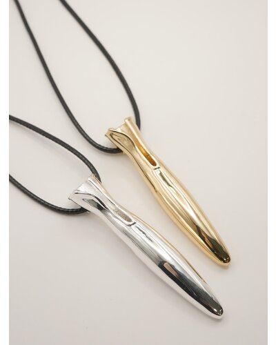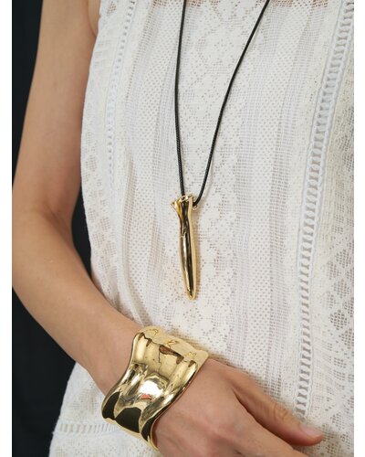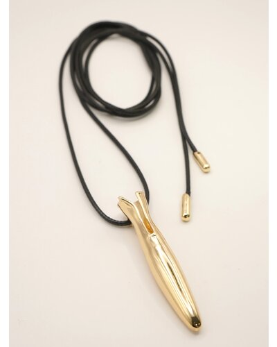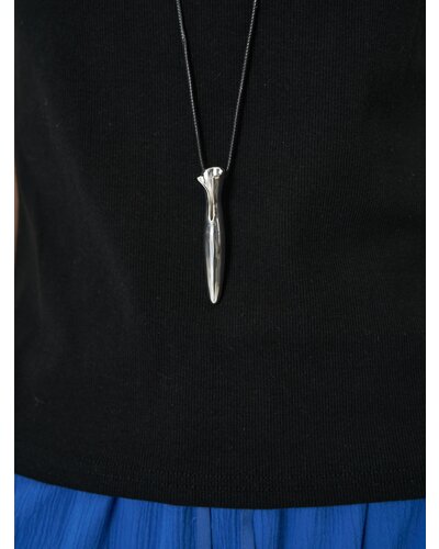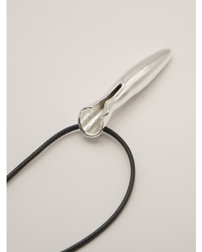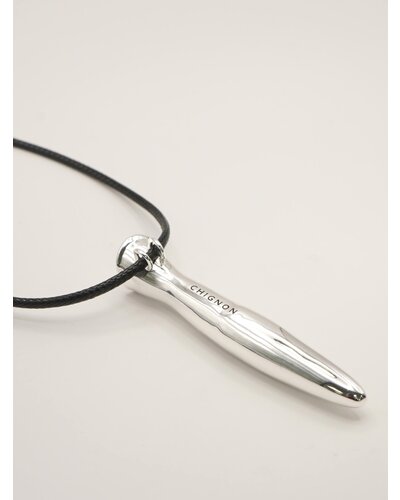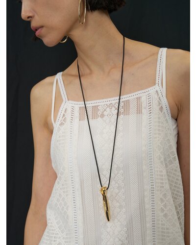 シャツの前開きスリットのようなデザインと花瓶のような長い筒が特徴的なコードタイプのロングネックレス。有機的なモチーフと黒コードの組み合わせは、いつものコーデにプラスするだけでさらりとかっこよく決まります。コード先端にはCHIGNONオリジナルキャップを施しており、結び目で長さ調節が可能なのでトップスに合わせてお好きな位置に着けられます。また、モチーフは取り外し可能なのでコードのみチョーカー風に使用することも可能となっております。