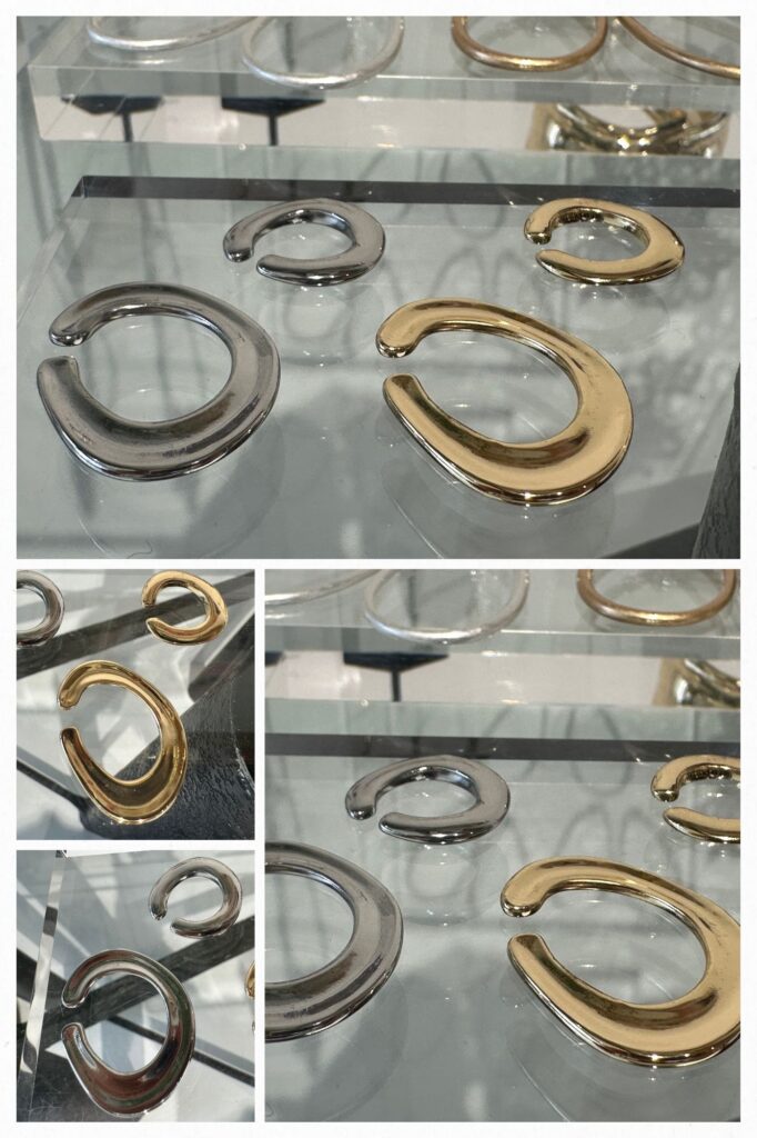 それぞれ大きさや表面のテクスチャーの違う2個セットのイヤカフは、1個でも十分存在感を発揮してくれるので単品でつけるのはもちろん、片耳に2個重ね付けしたり、お手持ちの