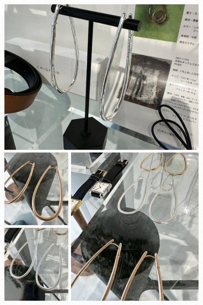 ドロップ型の大振りフープピアスは、後ろから見てもシンプルで無駄のない仕様にしています。線径の太さを箇所によって少しずつ変えているので単調になりすぎず&独特なニュアンス感が出過ぎないようにスッキリしたデザインに仕上げています。また、キャッチレスなのでキャッチを無くす心配も無く、着脱もスムーズにできるのもポイントです。大振りなサイズなので小顔効果も◎背面内側には「CHIGNON」の刻印入り。同型イヤリングもご用意いたしております。
