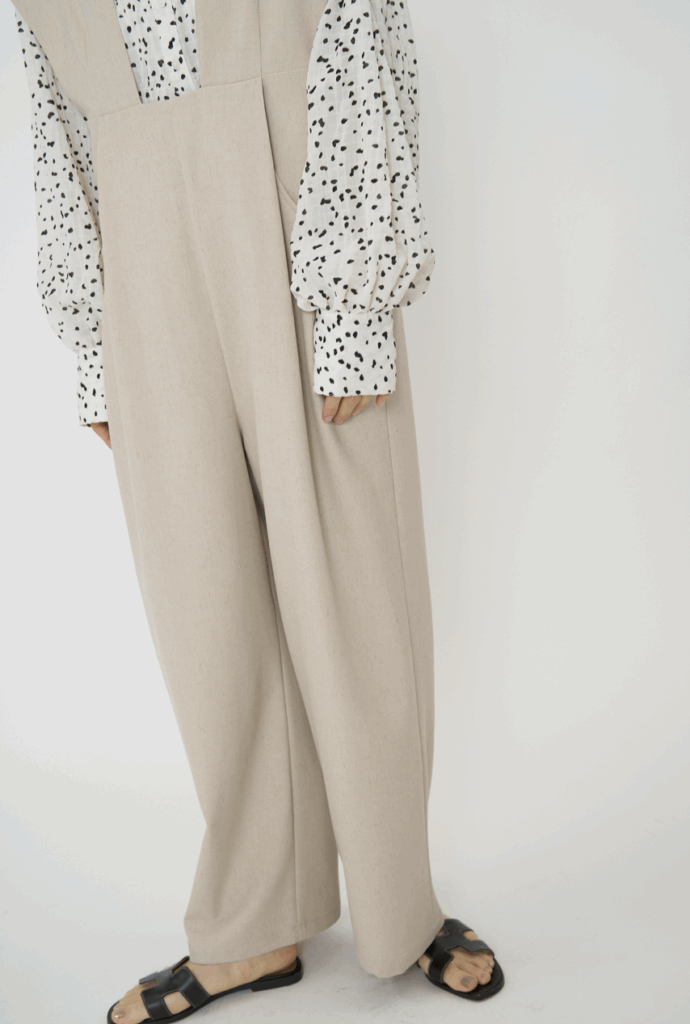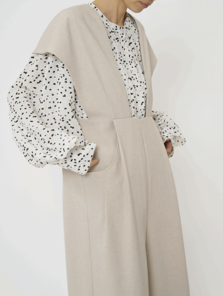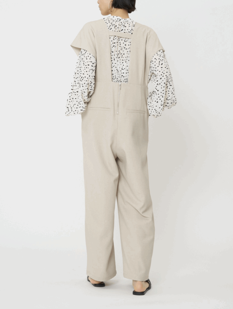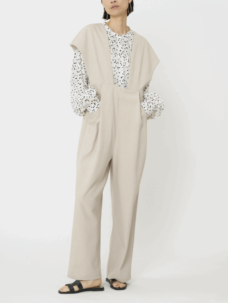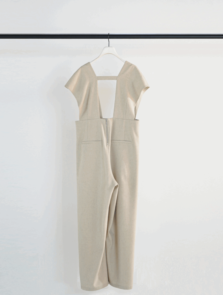 ポリエステルベースに麻(リネン)をブレンドした、絶妙なミックス感を持つ素材のコンビネゾン。