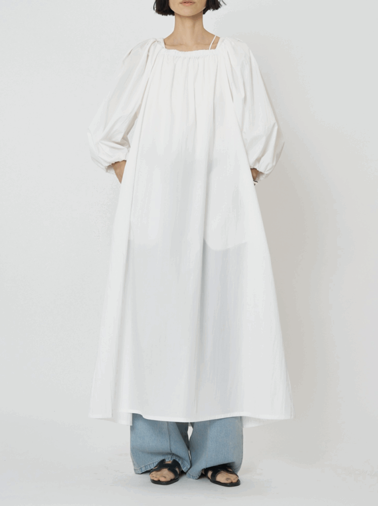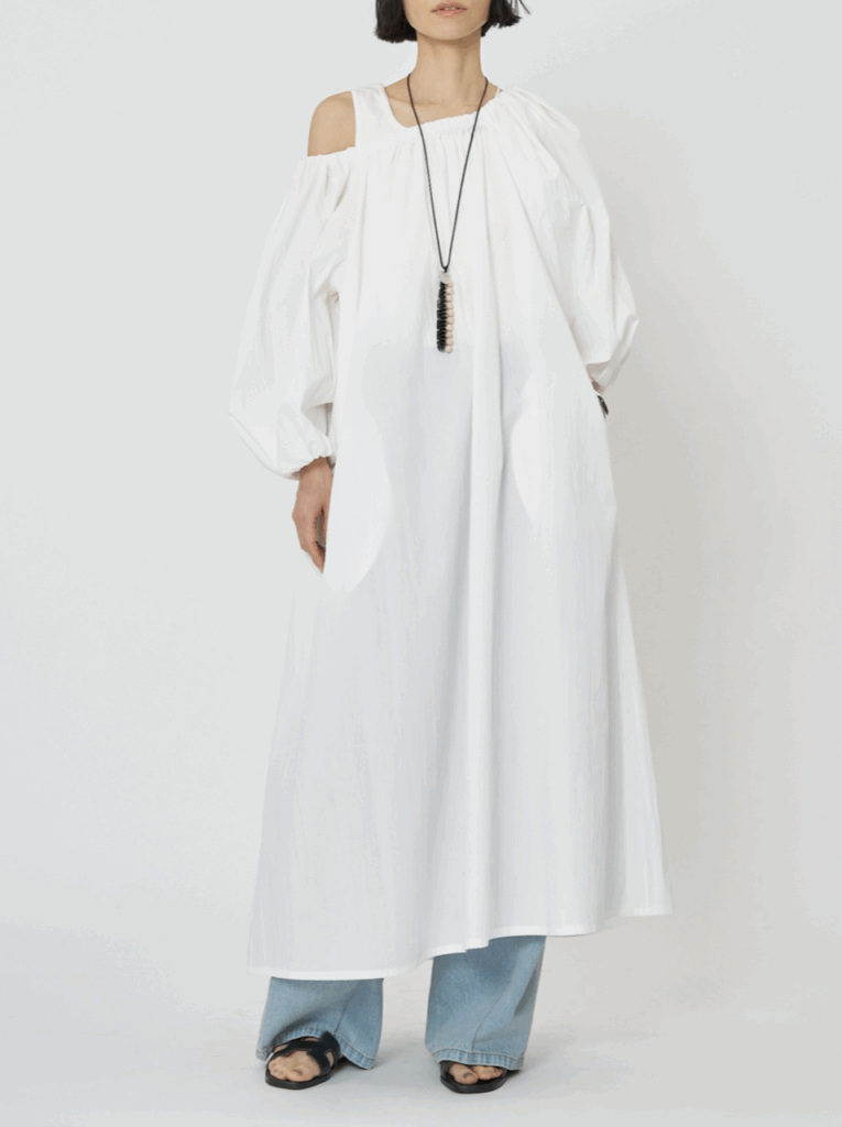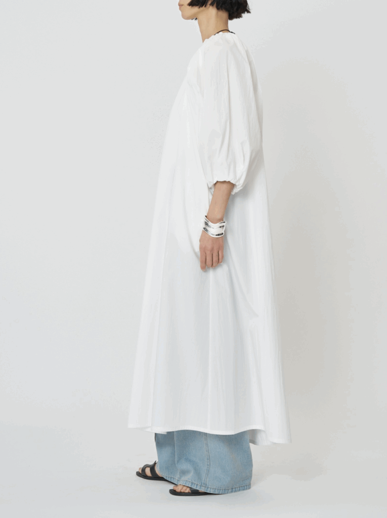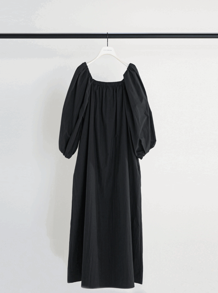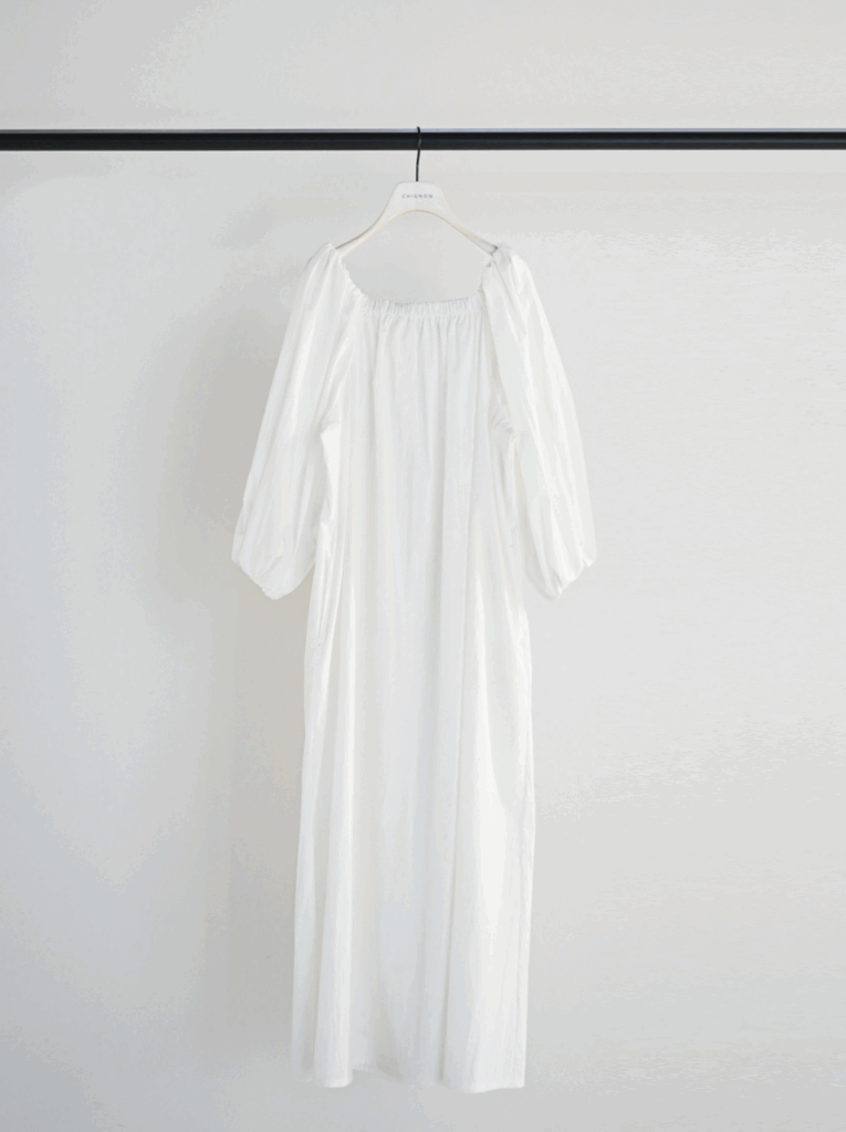 広く開いた衿ぐりがデコルテをすっきりと見せてくれる、リラクシーな大人ワンピース。