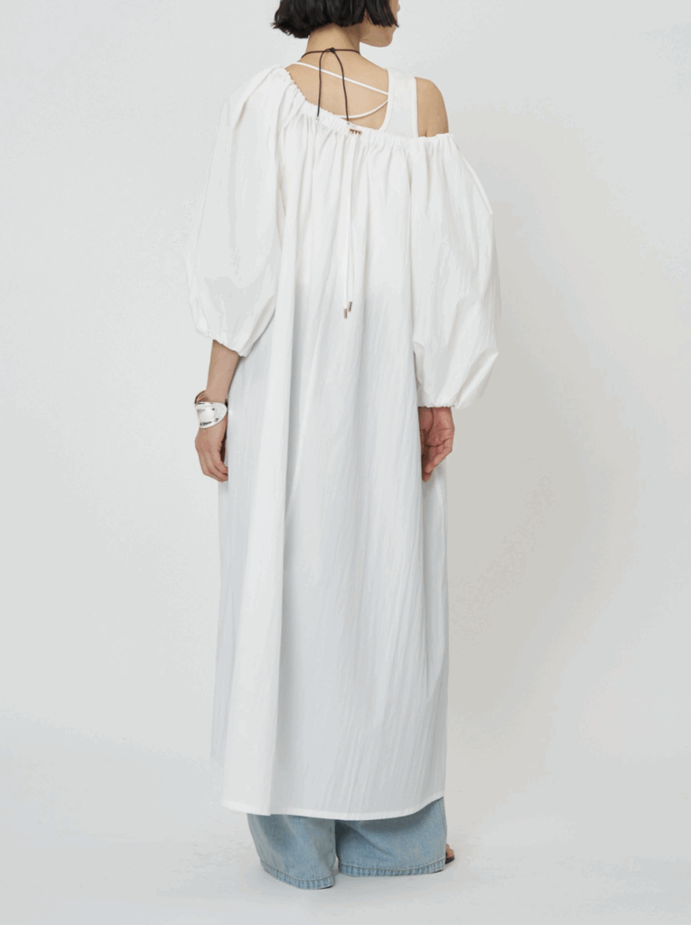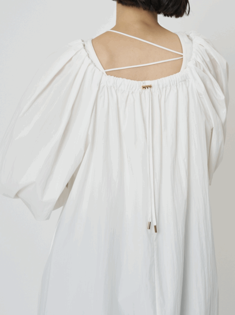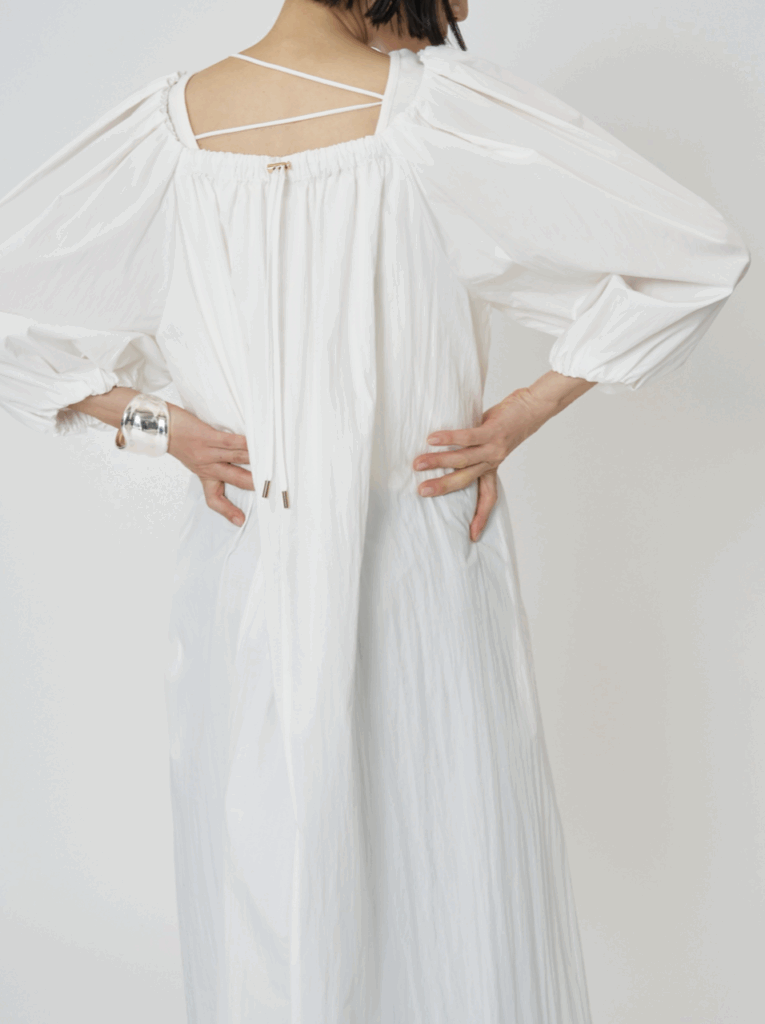 ゴールドのストッパーとコードエンドが、さりげないデザインポイントにもなっており、バックスタイルまで抜かりのない1枚。