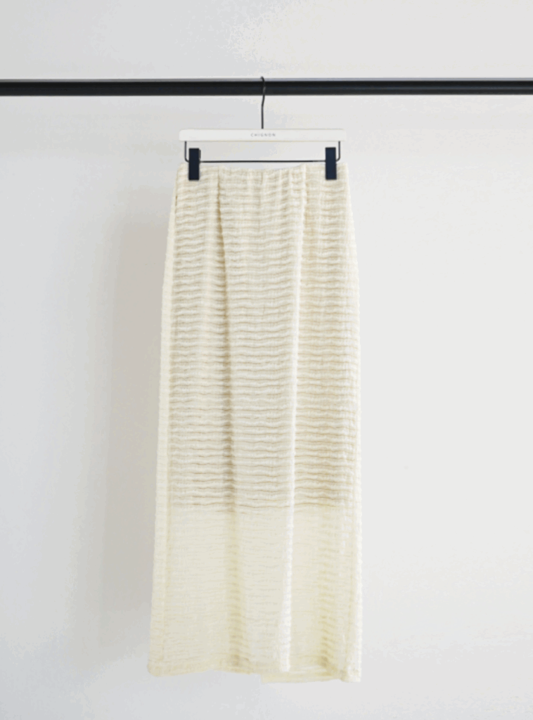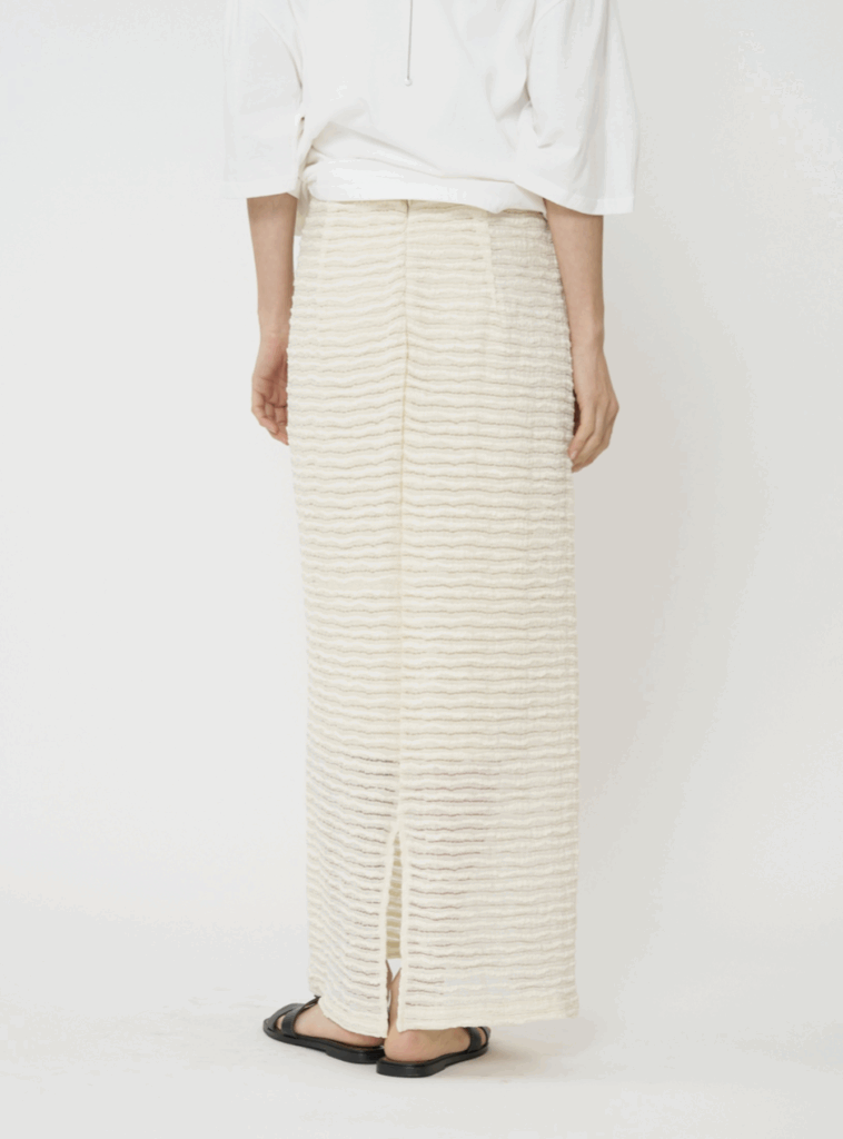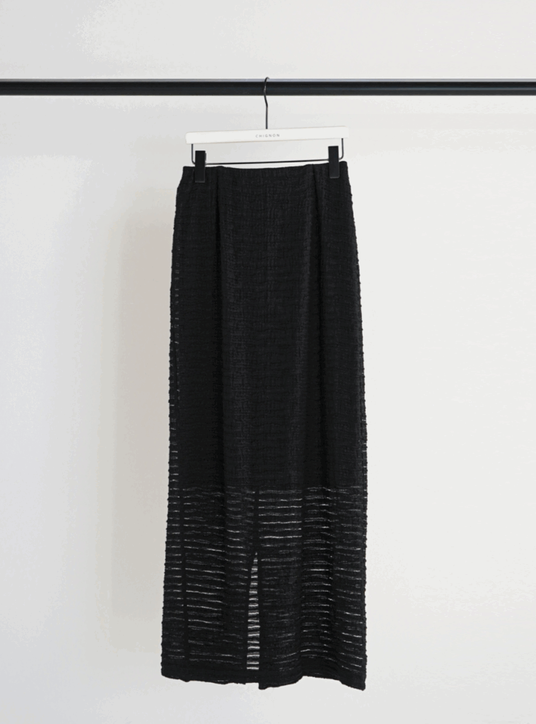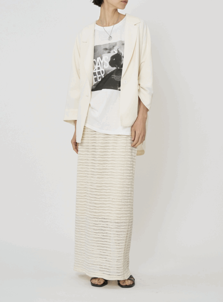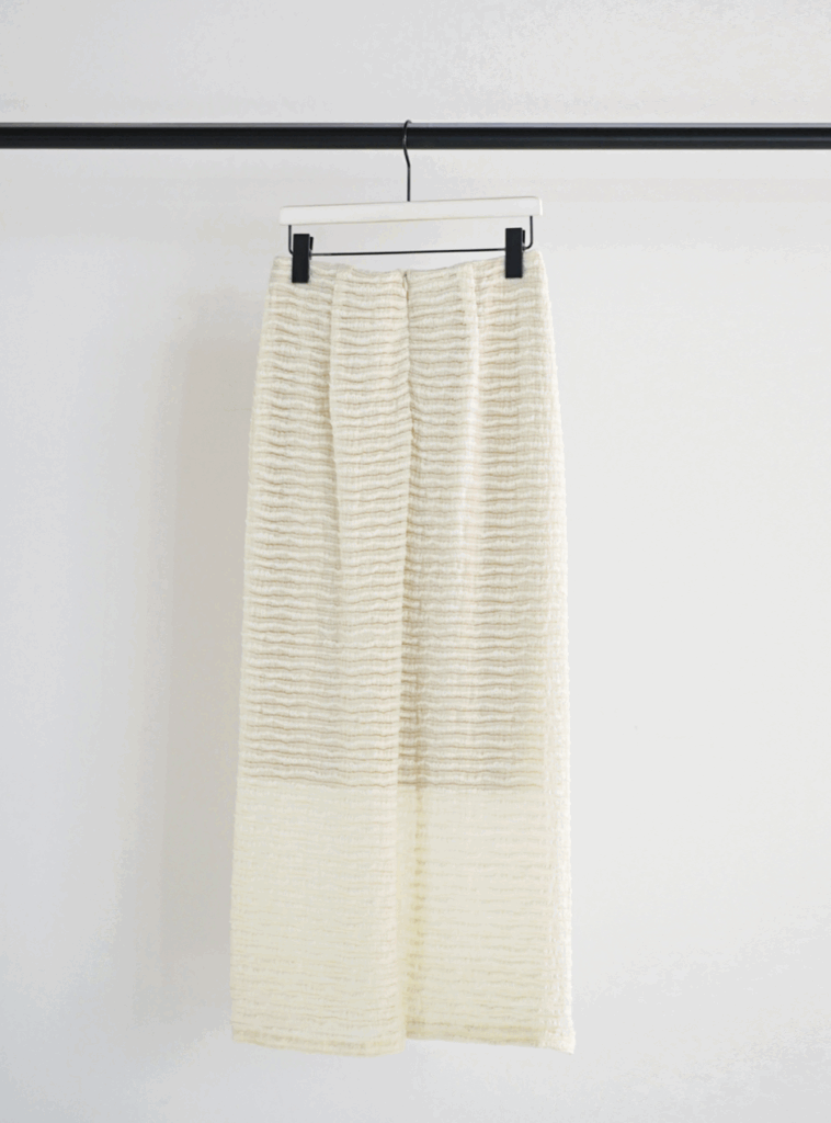 クラフト感のあるジャカードレースを横づかいし、ボーダー調の畝が効いたストレッチ性の高いレーススカートに仕立てました。伸びの良い生地で動きやすく、スタイルアップ効果も抜群。足元の透け感が軽やかで、シンプルなスタイリングに華やかさをプラスしてくれます。