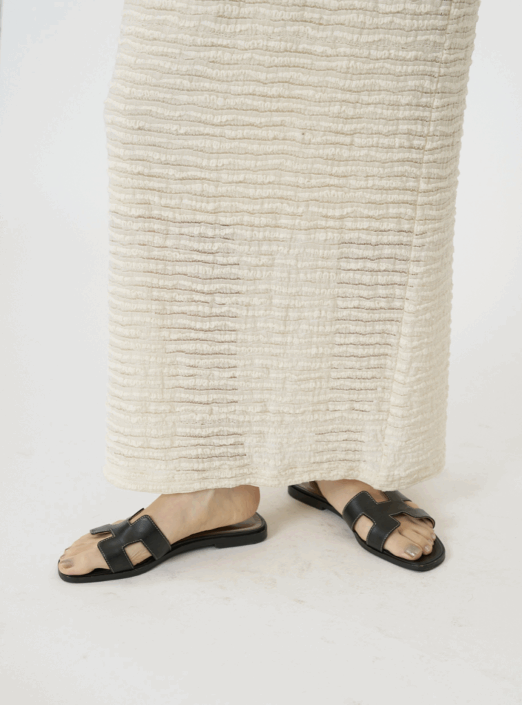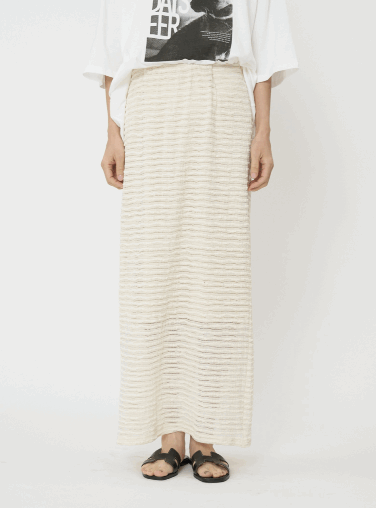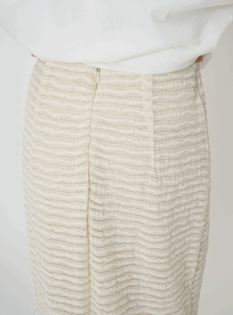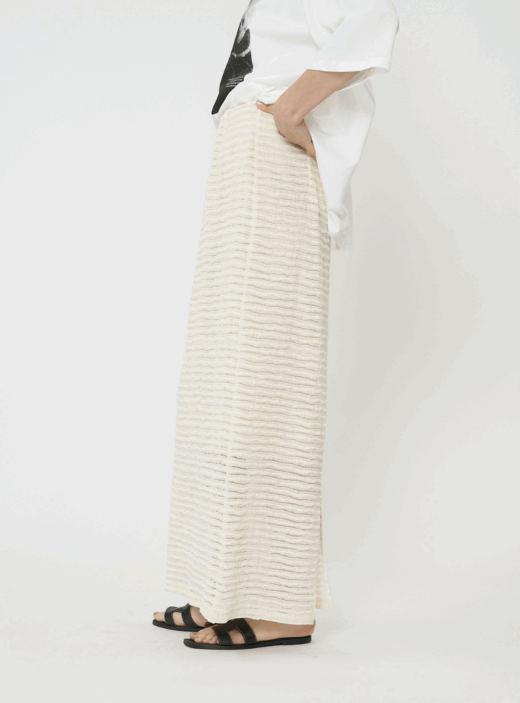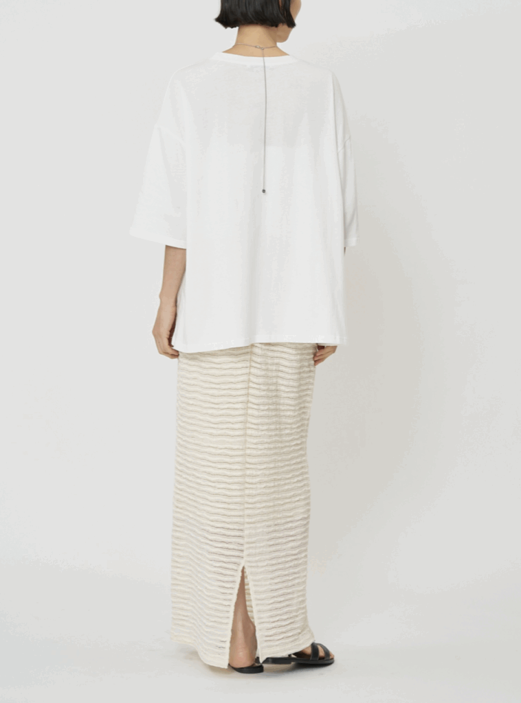クラフト感のあるジャカードレースを横づかいし、ボーダー調の畝が効いたストレッチ性の高いレーススカートに仕立てました。伸びの良い生地で動きやすく、スタイルアップ効果も抜群。足元の透け感が軽やかで、シンプルなスタイリングに華やかさをプラスしてくれます。