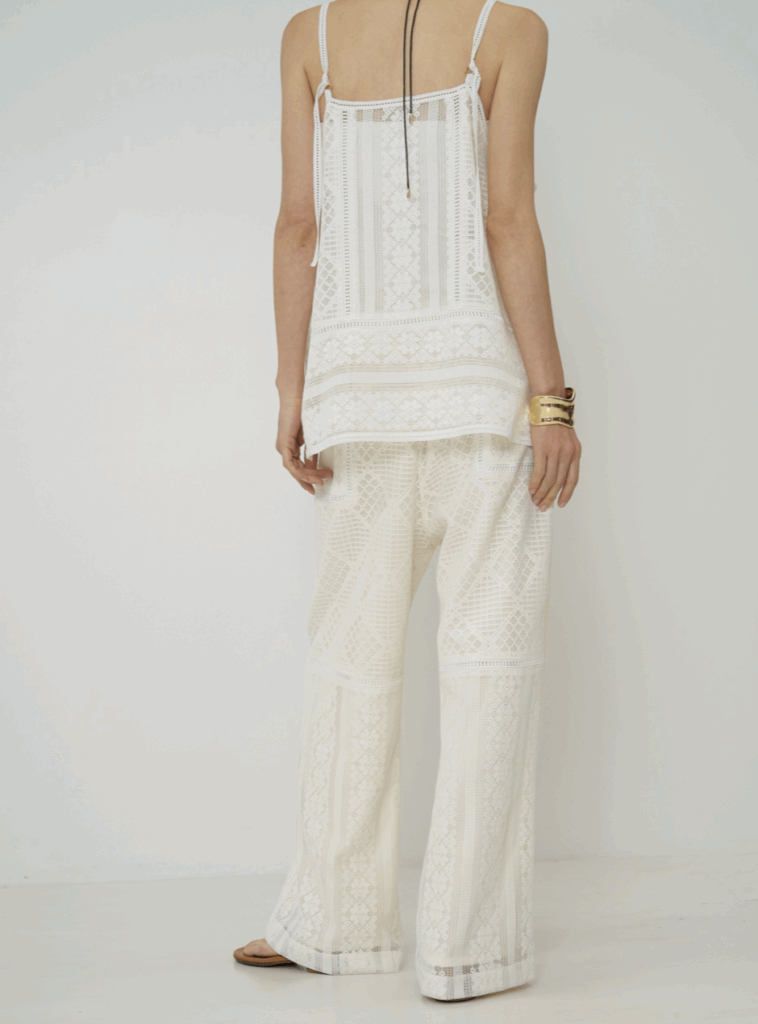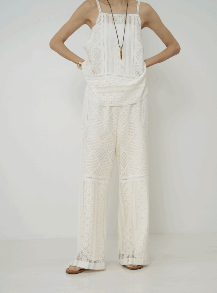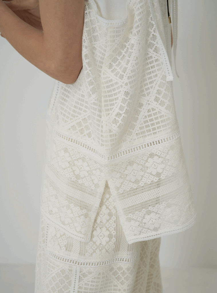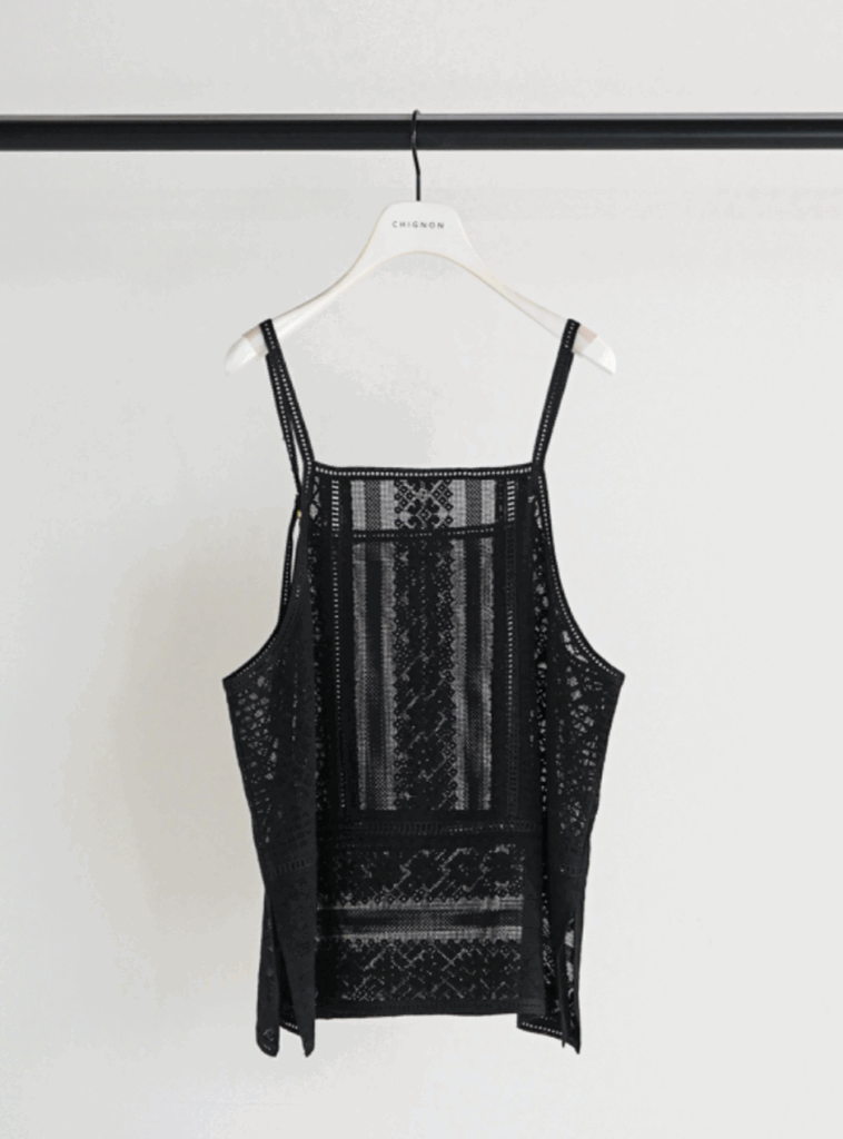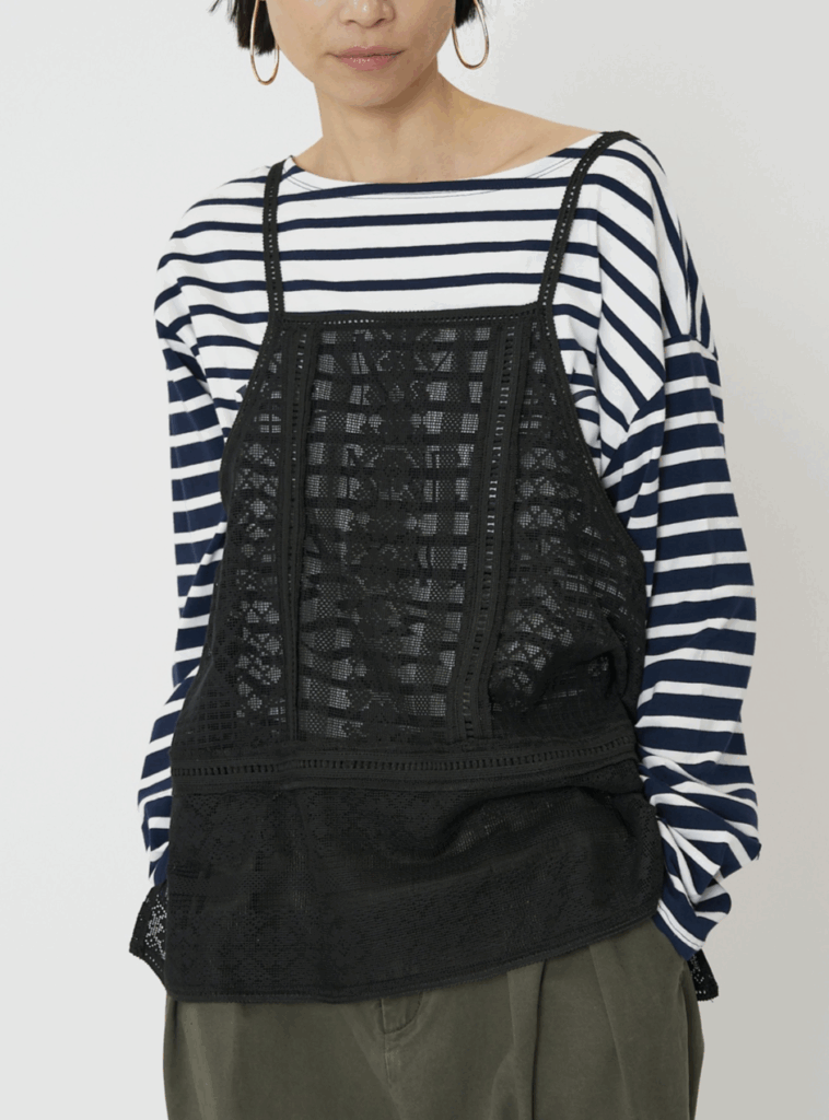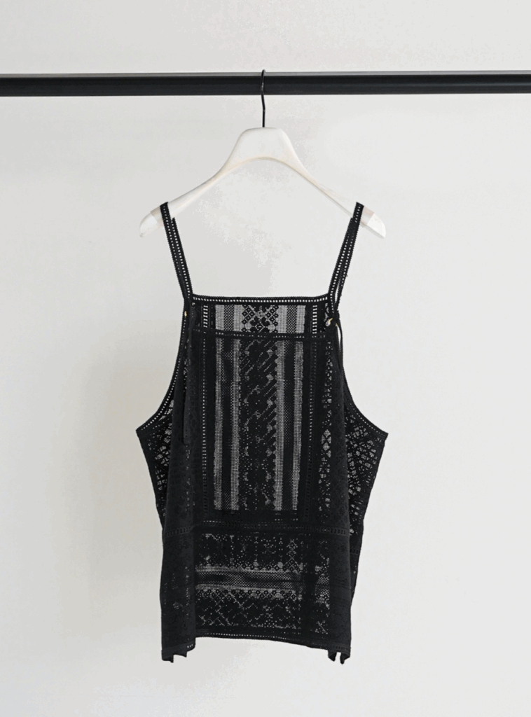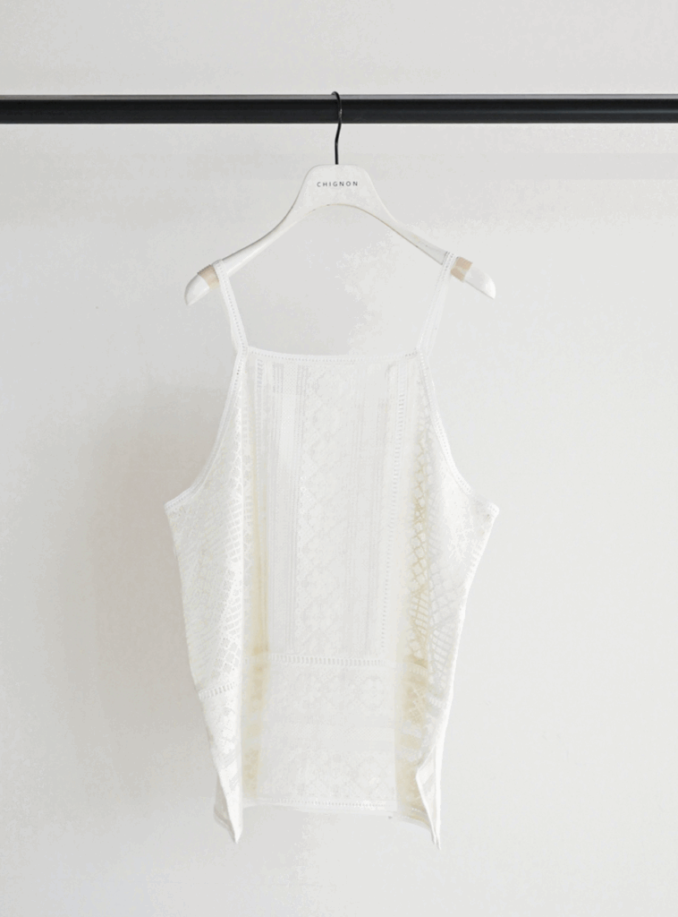表情の異なる2種類のレースとテープレースを贅沢に組み合わせた、パッチワークデザインのキャミソールです。