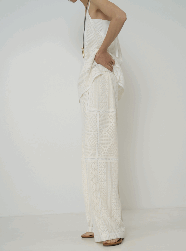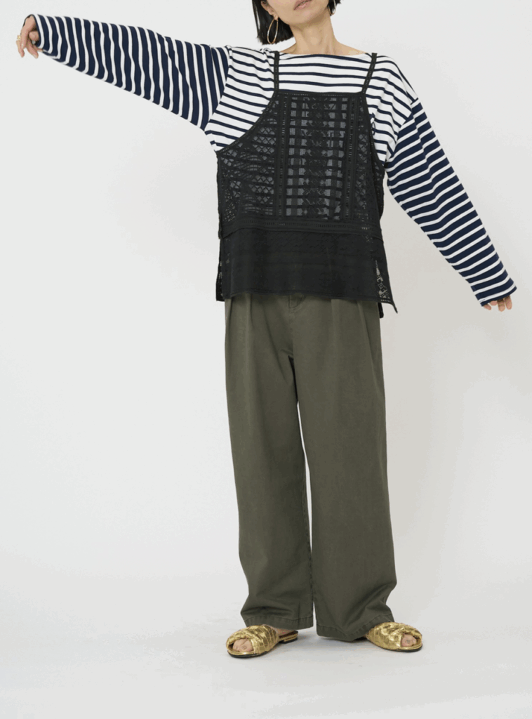 今季のトレンドであるデニムやヴィンテージスタイルに欠かせないレースアイテムを、綿混のナチュラルカジュアルな素材感で表現。エレガントになりすぎず、普段使いしやすい仕上がりです。