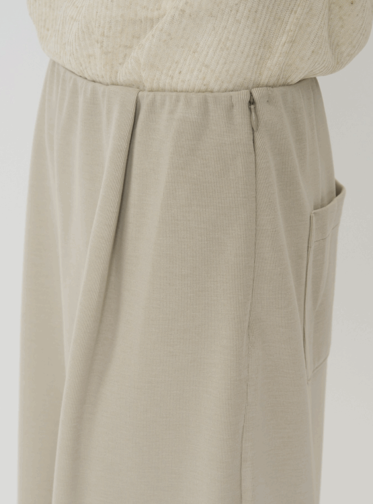 ウエストはインゴム仕様でリラックス感を残しつつも、すっきりとしたシルエットにこだわり、コンシールファスナーでの着脱にしました。