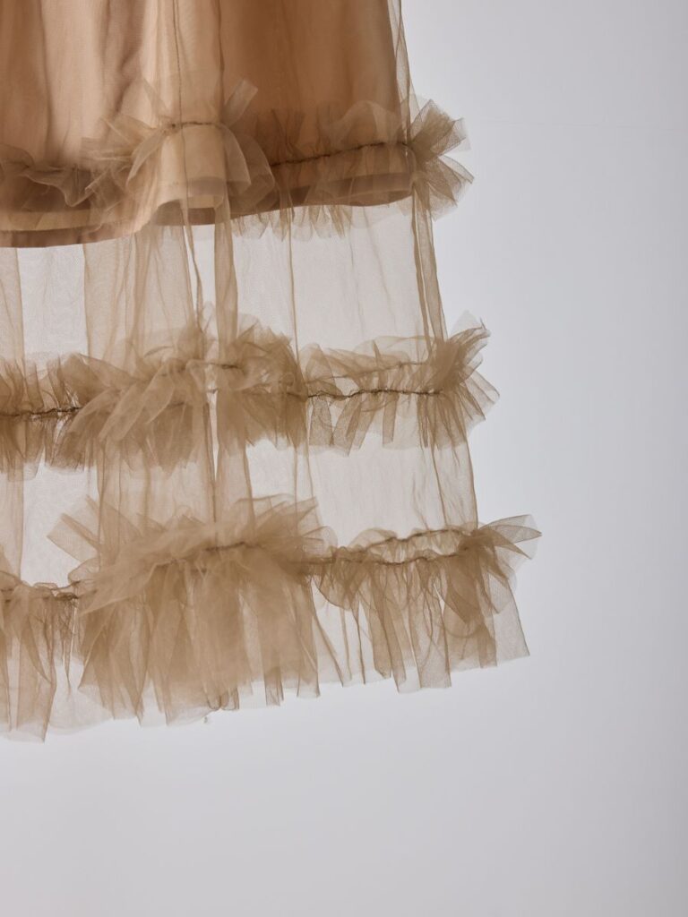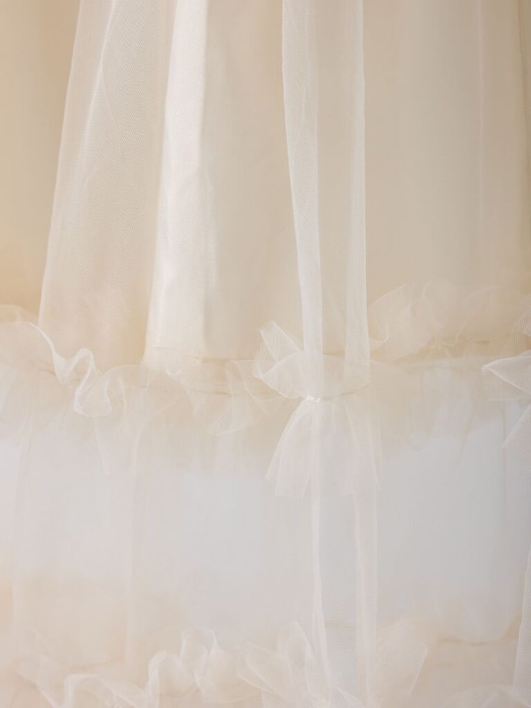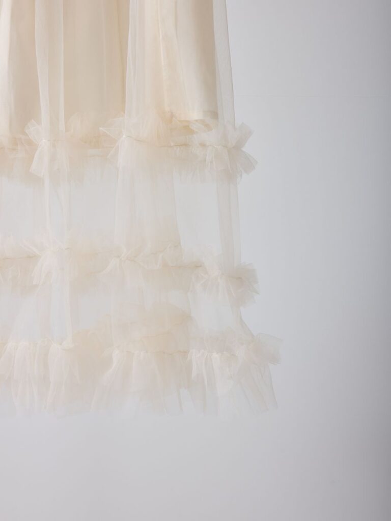 たっぷりとチュールを重ねたティアードスカートは、下の段にボリュームを集めることで、