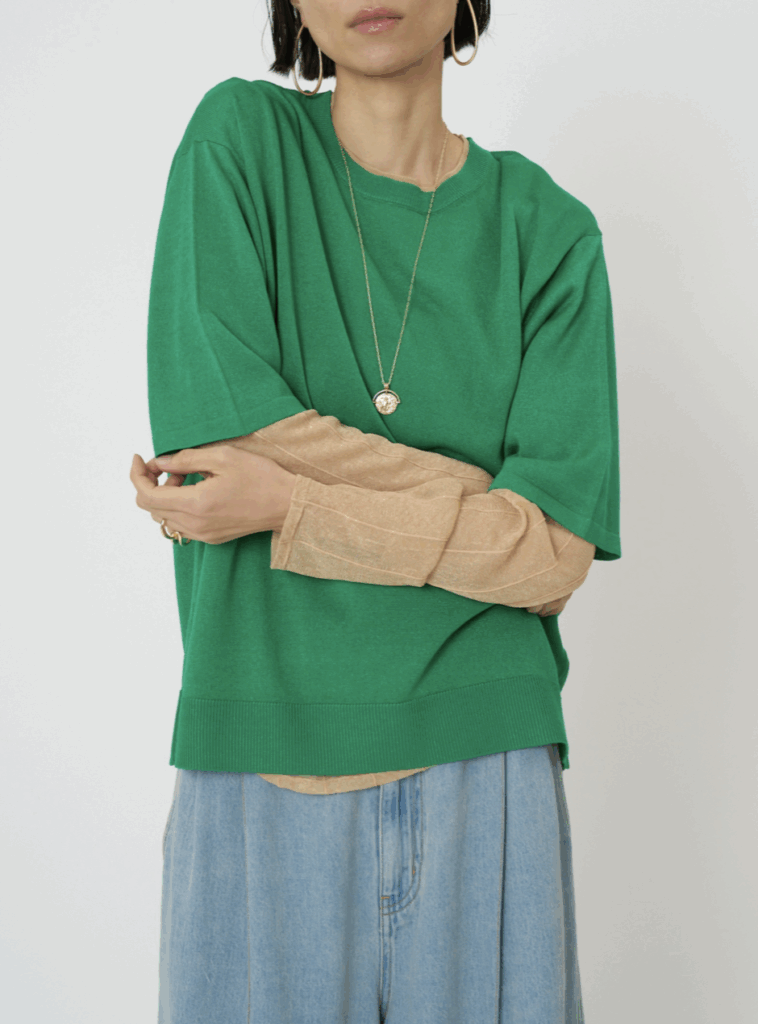 詰まり気味の衿ぐりと、ゆとりある身頃、肘がかくれる5分袖丈で、抜け感あるシルエットに仕上げています。