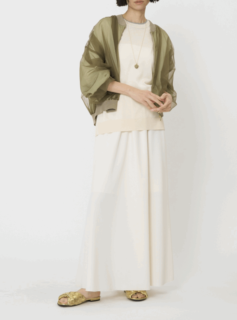 後ろ衿ぐりに光る、ゴールドのバーもアクセントになっています。
