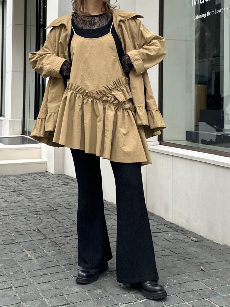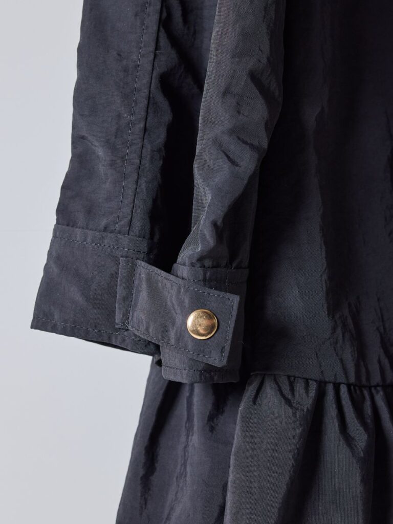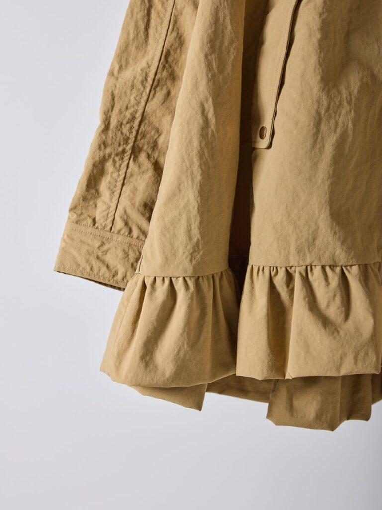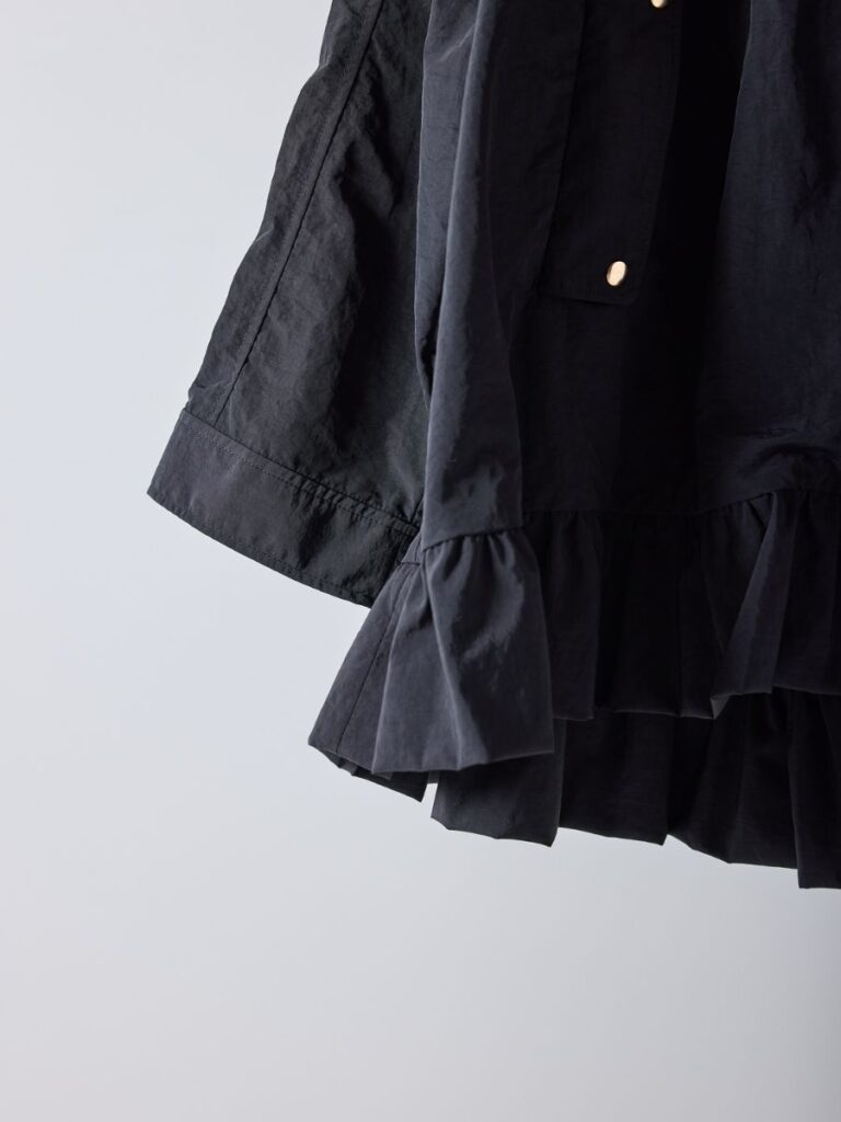 軽やかなナイロン素材を贅沢に使用し、裾にはたっぷりとフリルをあしらって大人の可愛さをプラス。