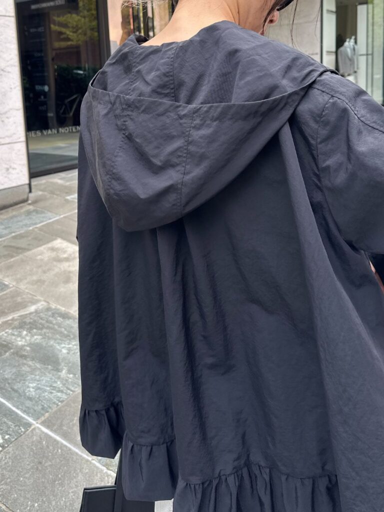 フードは高さをしっかり持たせて、春の日差しや風からも守ってくれる機能性も◎。