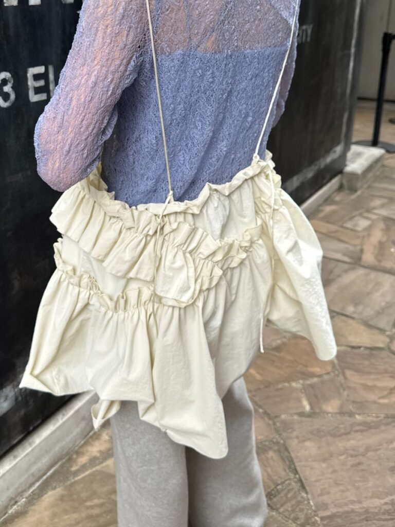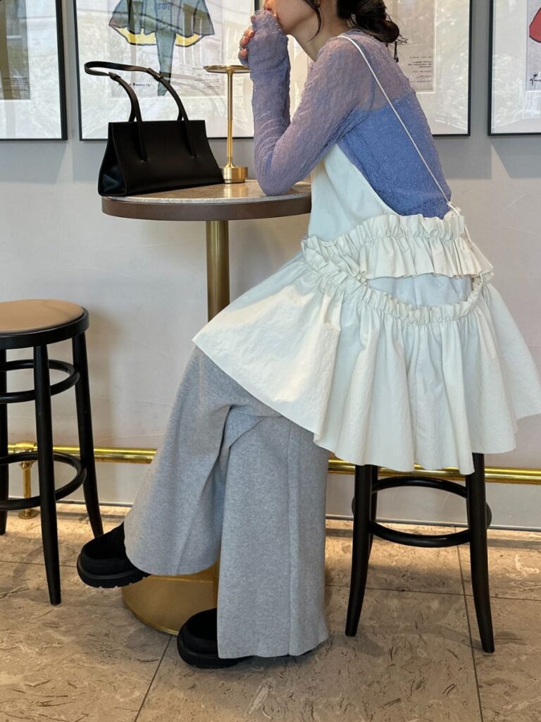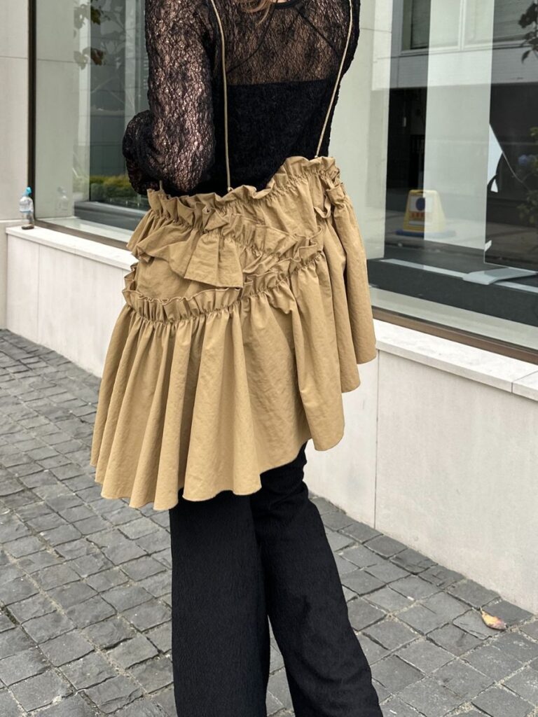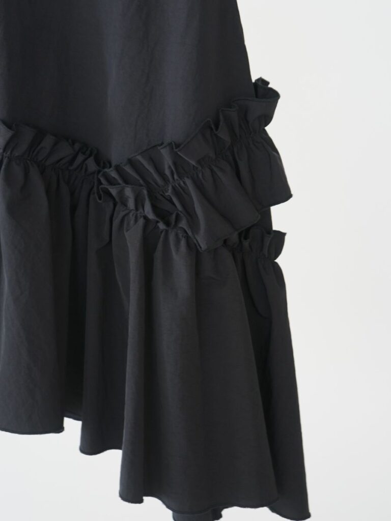 大胆にアシンメトリーにカットしたティアードフリルが、動くたびに表情を変えて印象的。
