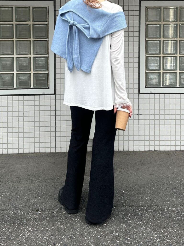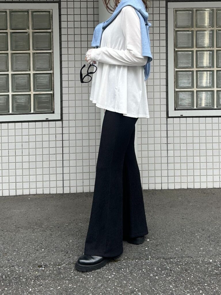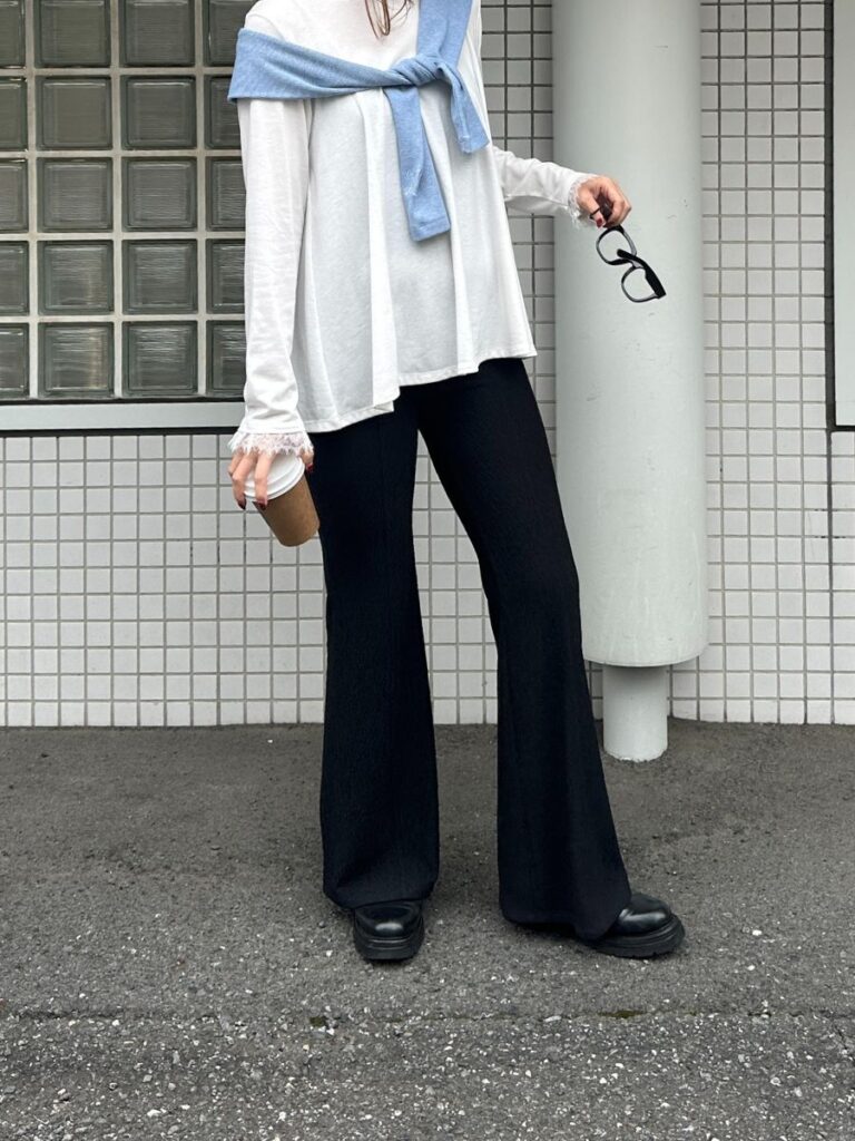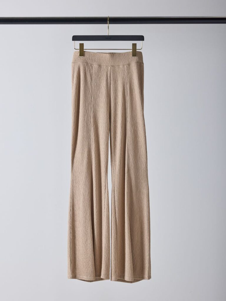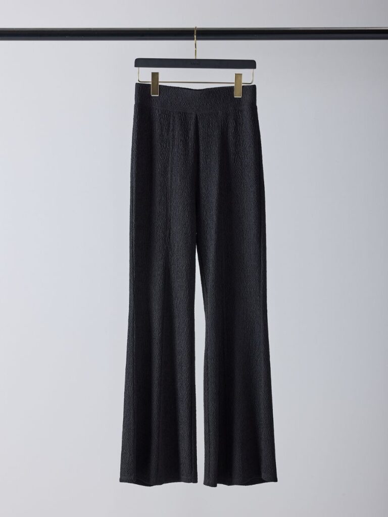 Mewlらしい美脚シルエットを追求した、ふくれジャガード素材のフレアパンツ。