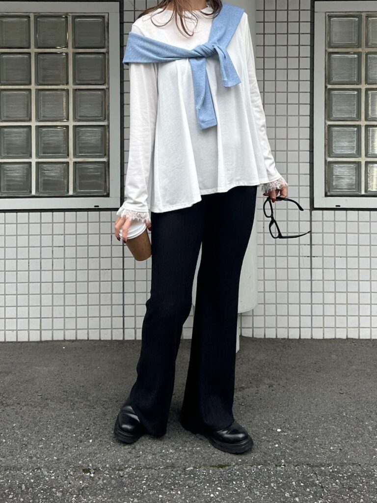 高めの膝位置から入れたフレアラインが、脚をすらりと長く美しく見せてくれます。