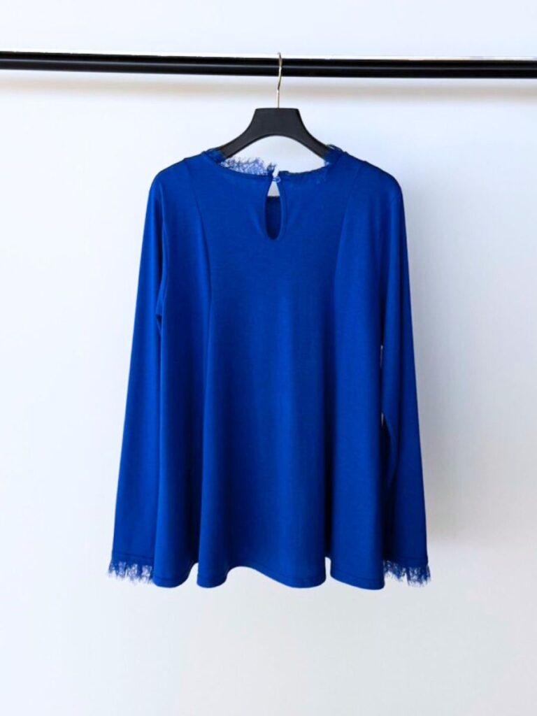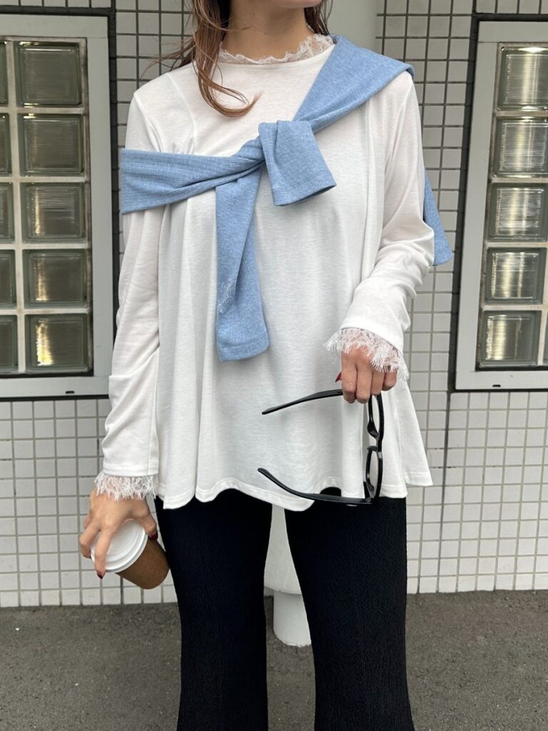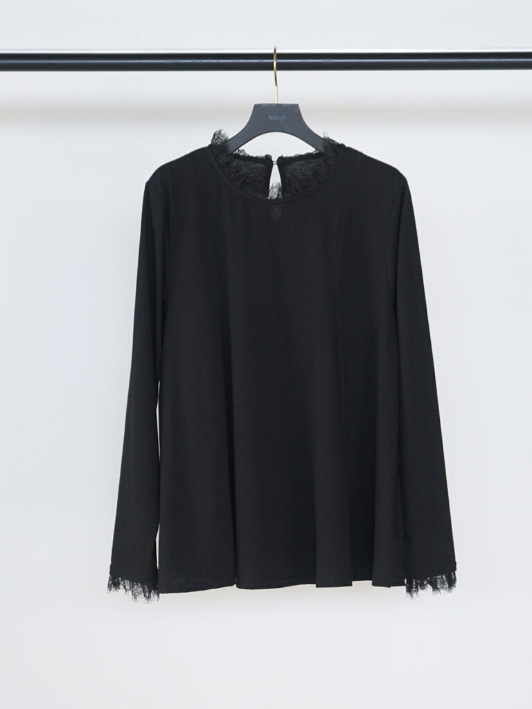 襟元と袖口にあしらった繊細なレースが、さりげなく女性らしさを添えるフレアトップス。