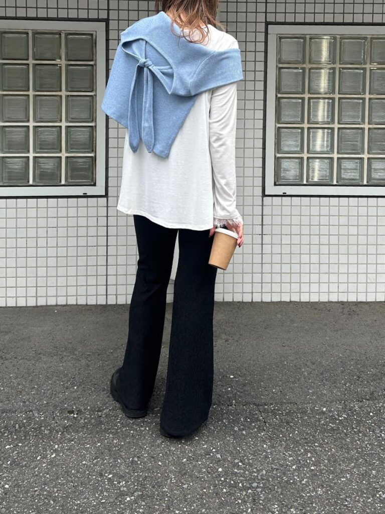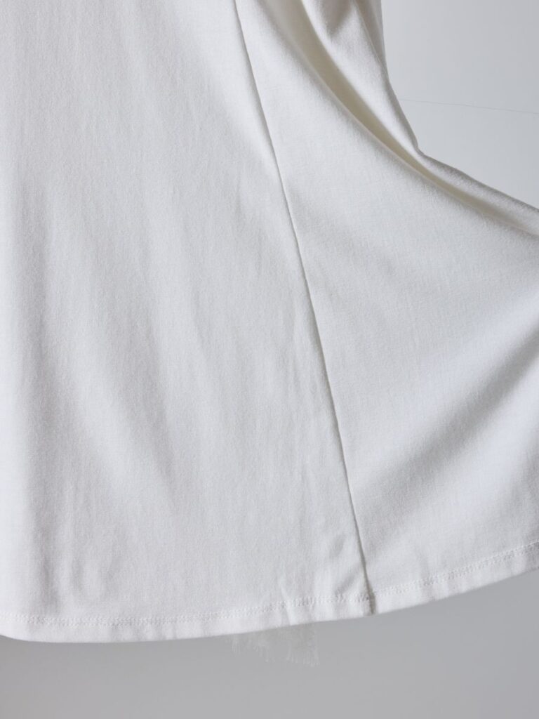 肌触りの良いカットソー素材で着心地は抜群ながら、ふんわりと広がるシルエットがカジュアルになりすぎず上品な印象に。