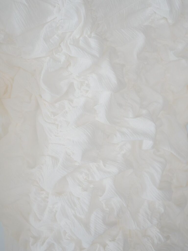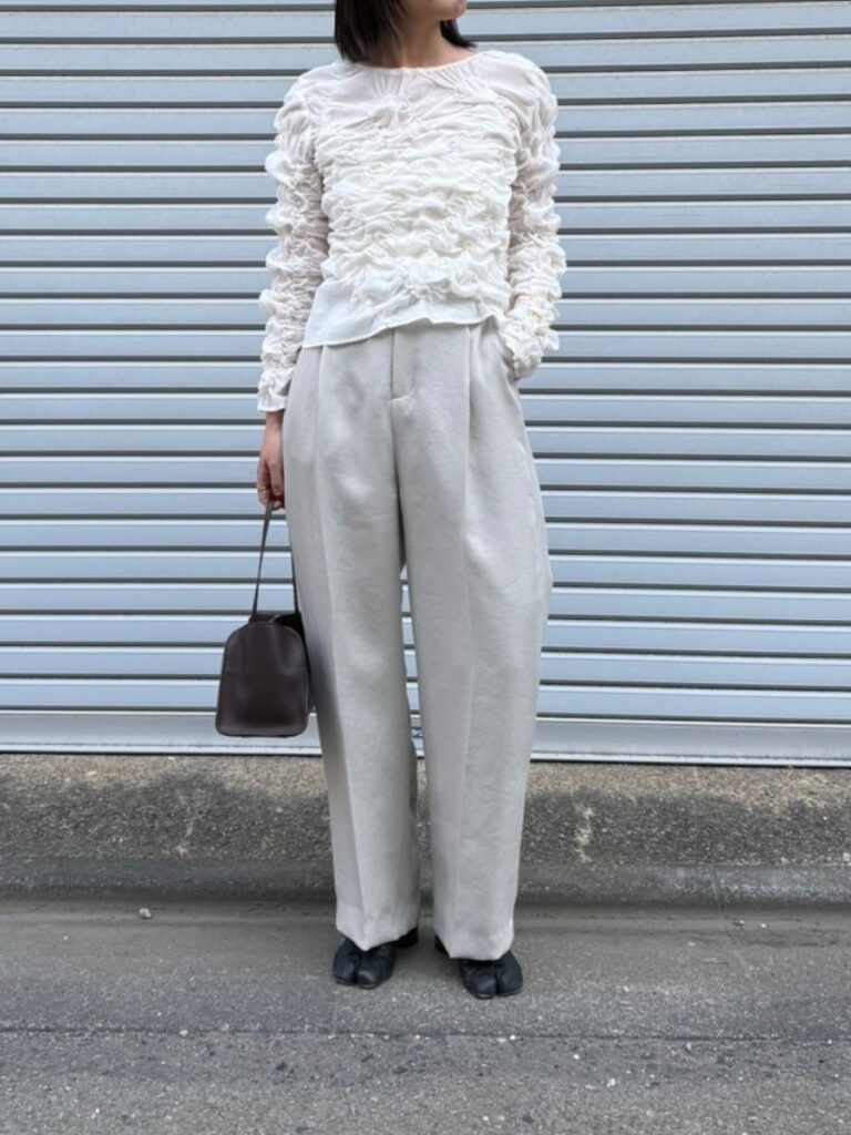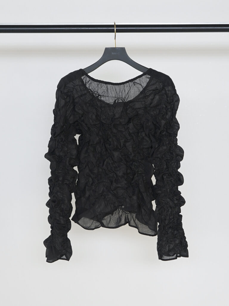 全体に無造作なシャーリングステッチを走らせ、ふんわりとした立体感を出した一枚。