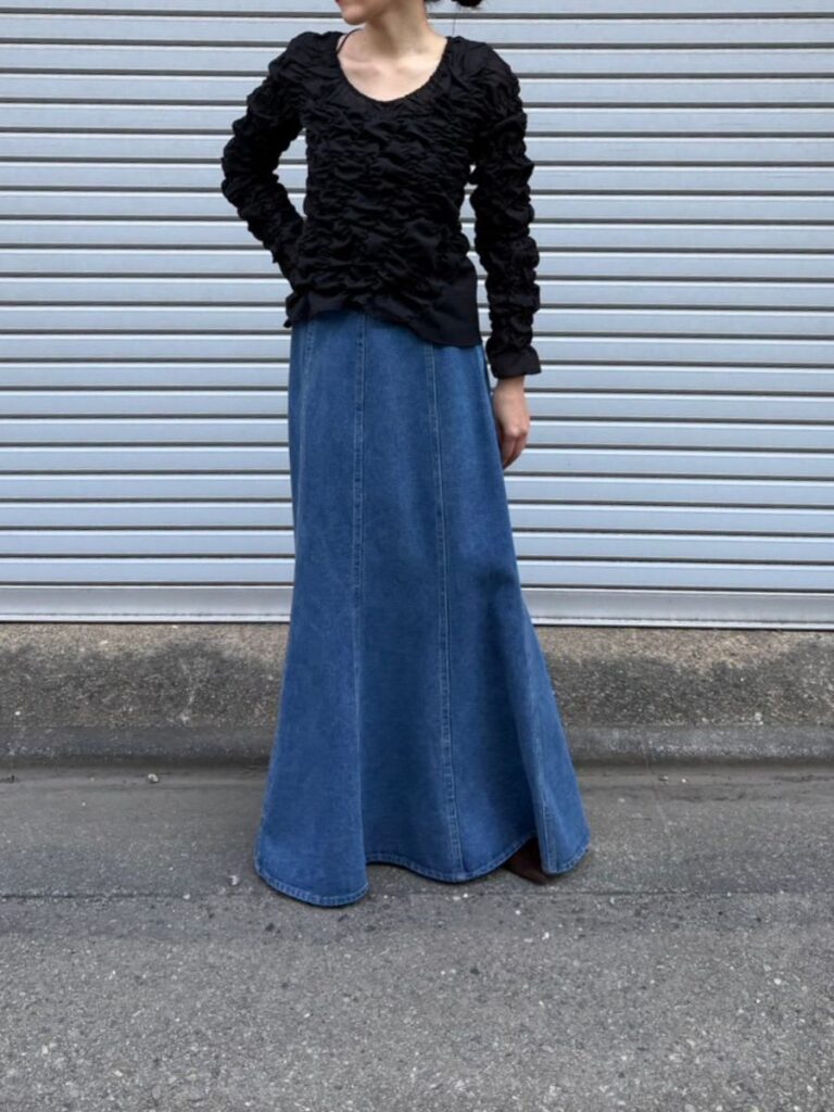 裾に向かってほんのり広がるフレアラインが、女性らしいシルエットを演出。