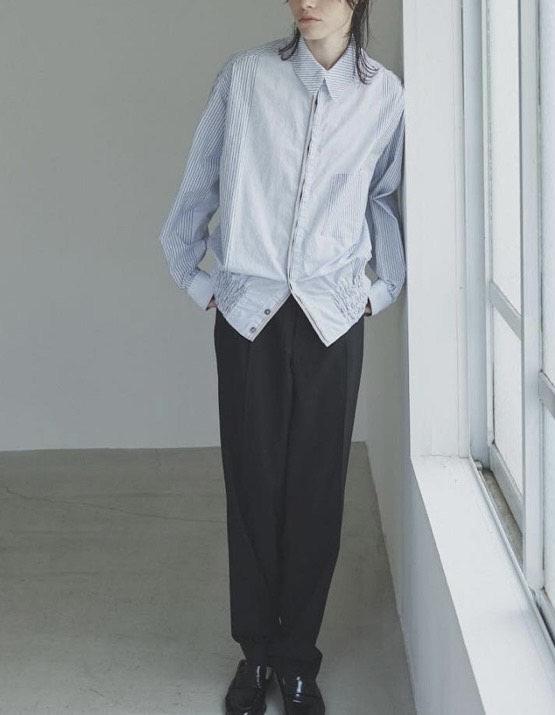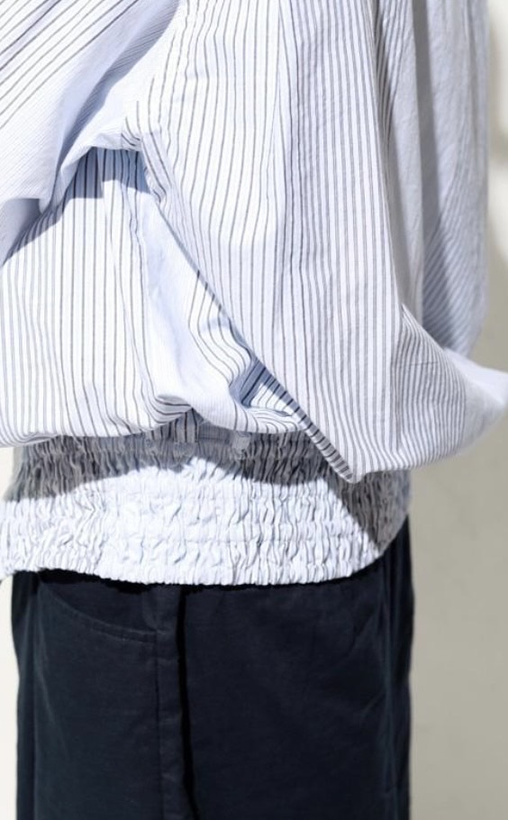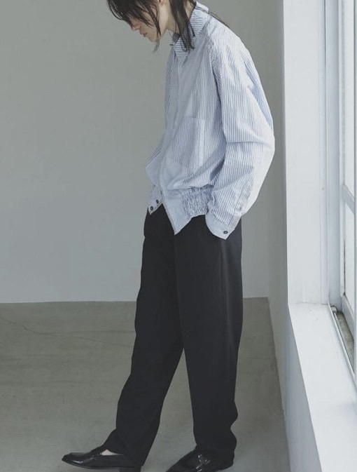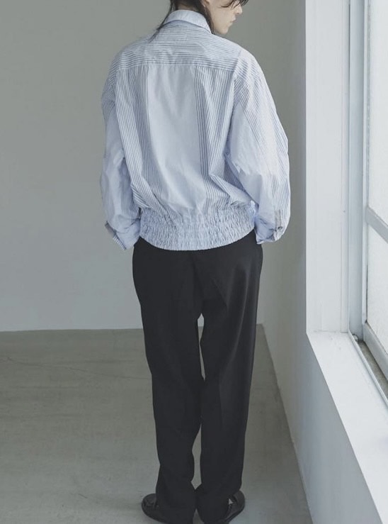 裾にはブルゾンのリブのようなギャザーを施し、ボタンを留めればブルゾン風に、開ければシャツのように羽織れる、表情豊かなアイテムです。