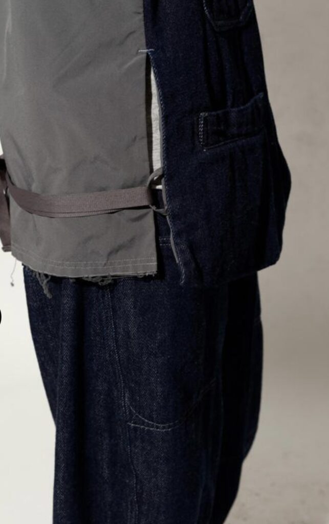 ゆったりとしたサイズ感に、雰囲気のある小ポケットや脇の深いスリット、後ろのテープ尾錠でシルエット調整ができる仕様など、実用性とデザイン性を両立。